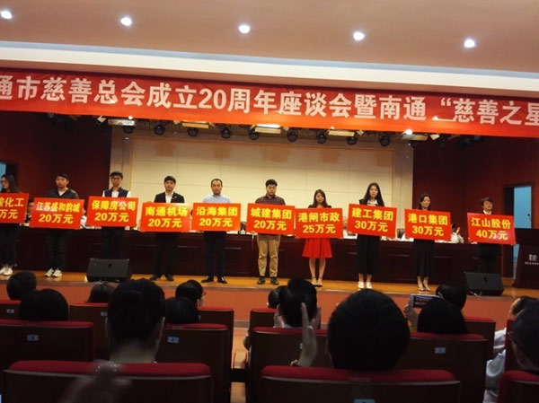 5月17日上午,慶祝南通市慈善總會成立20周年座談會暨南通“慈善之星”表彰會議在我市中華慈善博物館隆重舉行。江蘇省慈善總會會長蔣宏坤,中共南通市委書記陸志鵬,市委副書記、市長韓立明,市政協(xié)主席黃巍東等領導及市慈善總會歷任會長出席會議。 我公司應邀參會并現(xiàn)場捐贈愛心款25萬元,以實際行動慶賀慈善總會成立20周年。