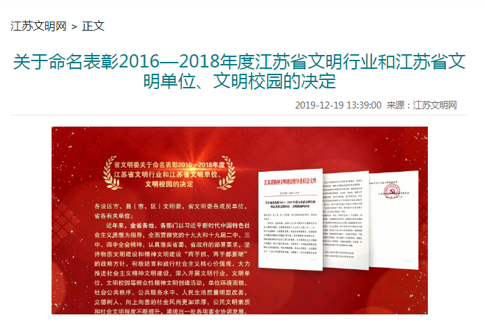 日前,江蘇省精神文明建設(shè)委員會(huì)印發(fā)《關(guān)于命名表彰2016—2018年度江蘇省文明行業(yè)和江蘇省文明單位、文明校園的決定》,我公司再次榮獲“江蘇省文明單位”榮譽(yù)稱號(hào)。