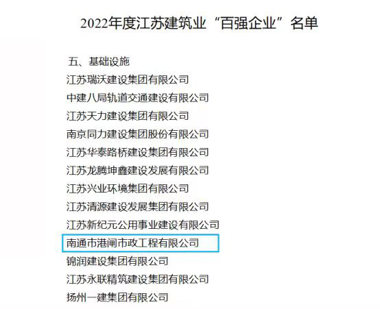 7月4日,江蘇省住房和城鄉(xiāng)建設(shè)廳公布2022年度江蘇省建筑業(yè)“百?gòu)?qiáng)企業(yè)”名單,我公司再創(chuàng)佳績(jī),榮獲“2022年度江蘇省建筑業(yè)百?gòu)?qiáng)企業(yè)(基礎(chǔ)設(shè)施類(lèi))”榮譽(yù)稱(chēng)號(hào)。